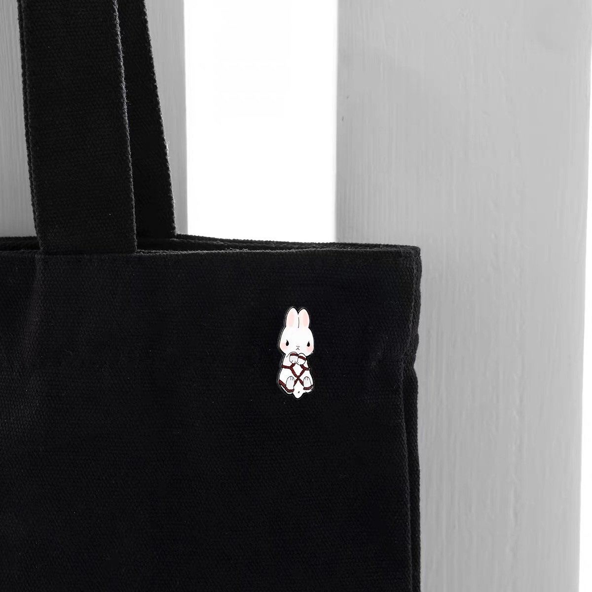 This adorable enamel pin features a cute white bunny tied with an intricate red rope pattern, inspired by the art of Shibari. It’s a fun and edgy kawaii brooch perfect for personalizing your jacket, backpack, or tote bag.
